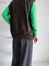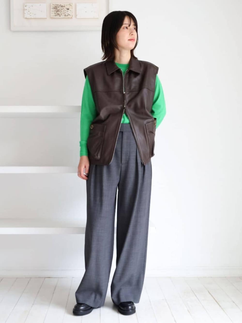 レザースリーブレスブルゾンは、デザイナーのこだわりがつまった1枚。 大きなアコーディオンポケットについた大きめのボタンがポイントに。 ざっくりいつものスタイルに羽織るだけで、様になります。 ロング丈のコートなどとレイヤードするスタイルもおすすめです。