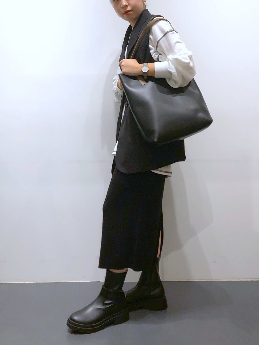 珍しくモノトーンコーデです🤍 スカートの後ろのスリットが可愛いですbb