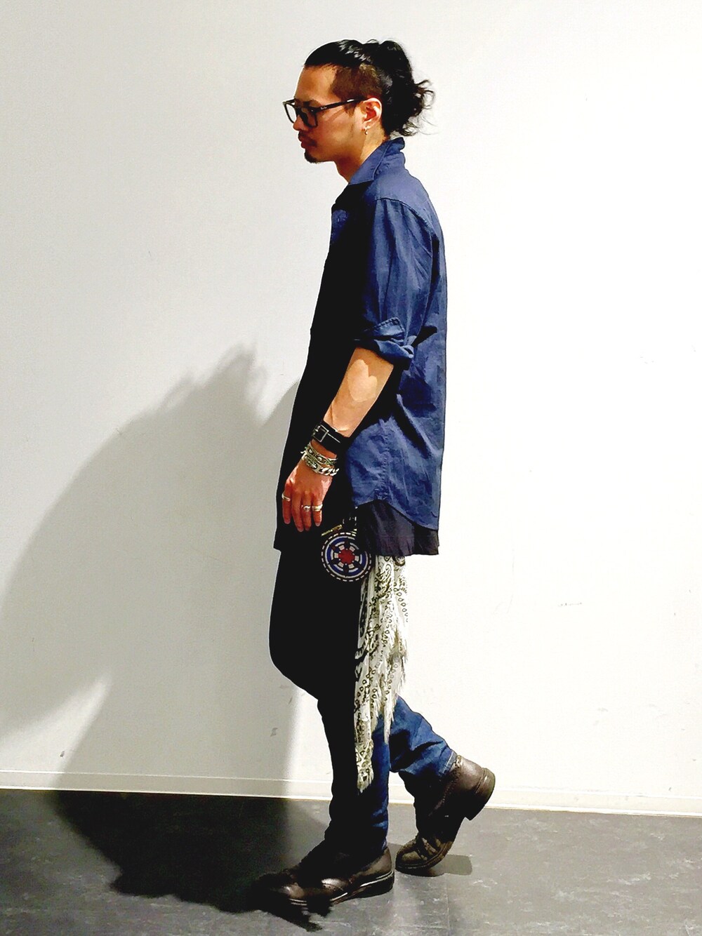 最近髪がもじゃってて、ハットじゃなく結ぶことが多い 店の中が冷房効き過ぎで寒かったから、シャツ羽織っちゃったよ。