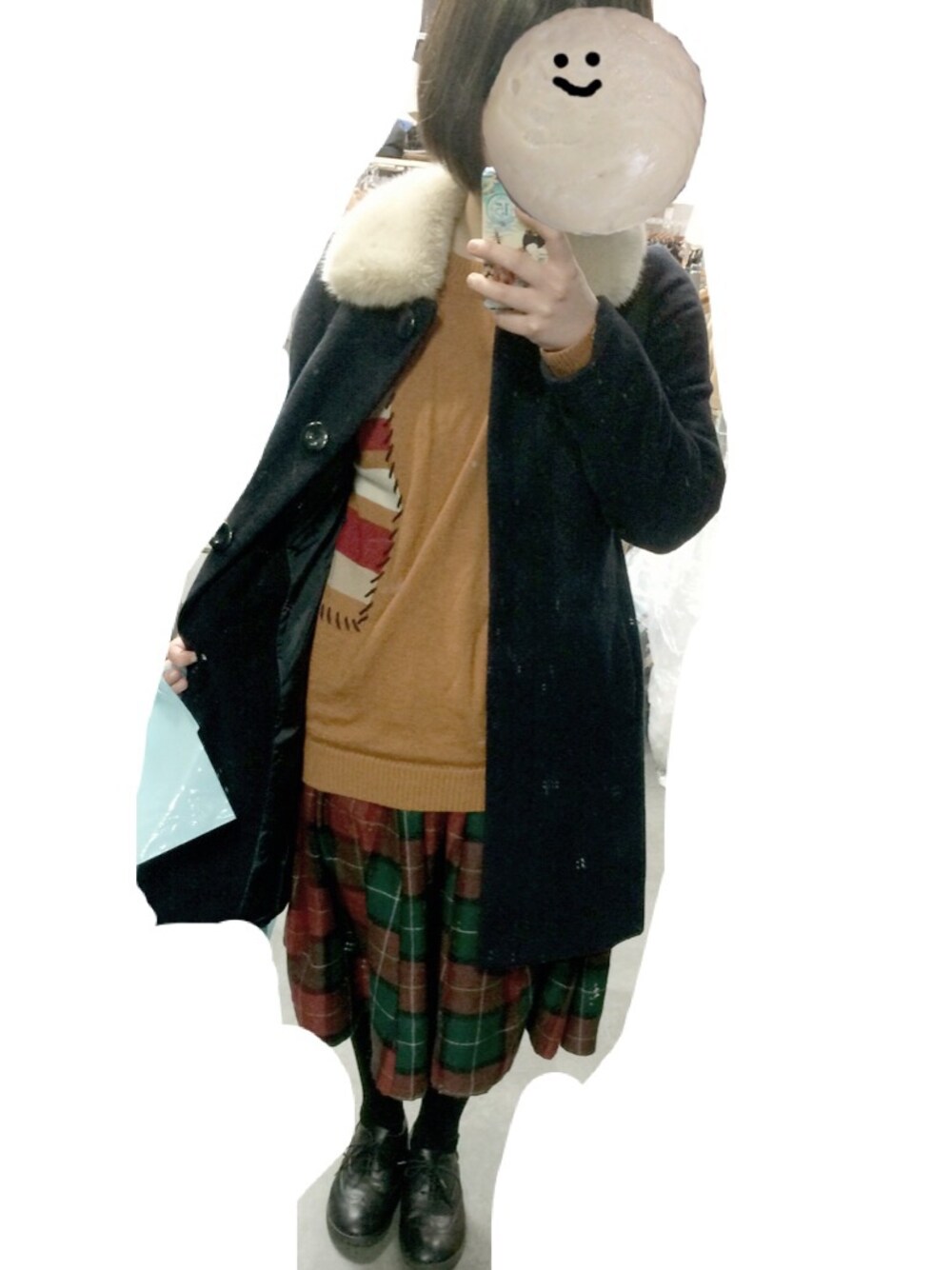 earthのコートは姉から成人祝いでもらいました。紺色です。 オレンジのニットの柄が可愛いので見せてみました。 あと髪の毛を切りました。