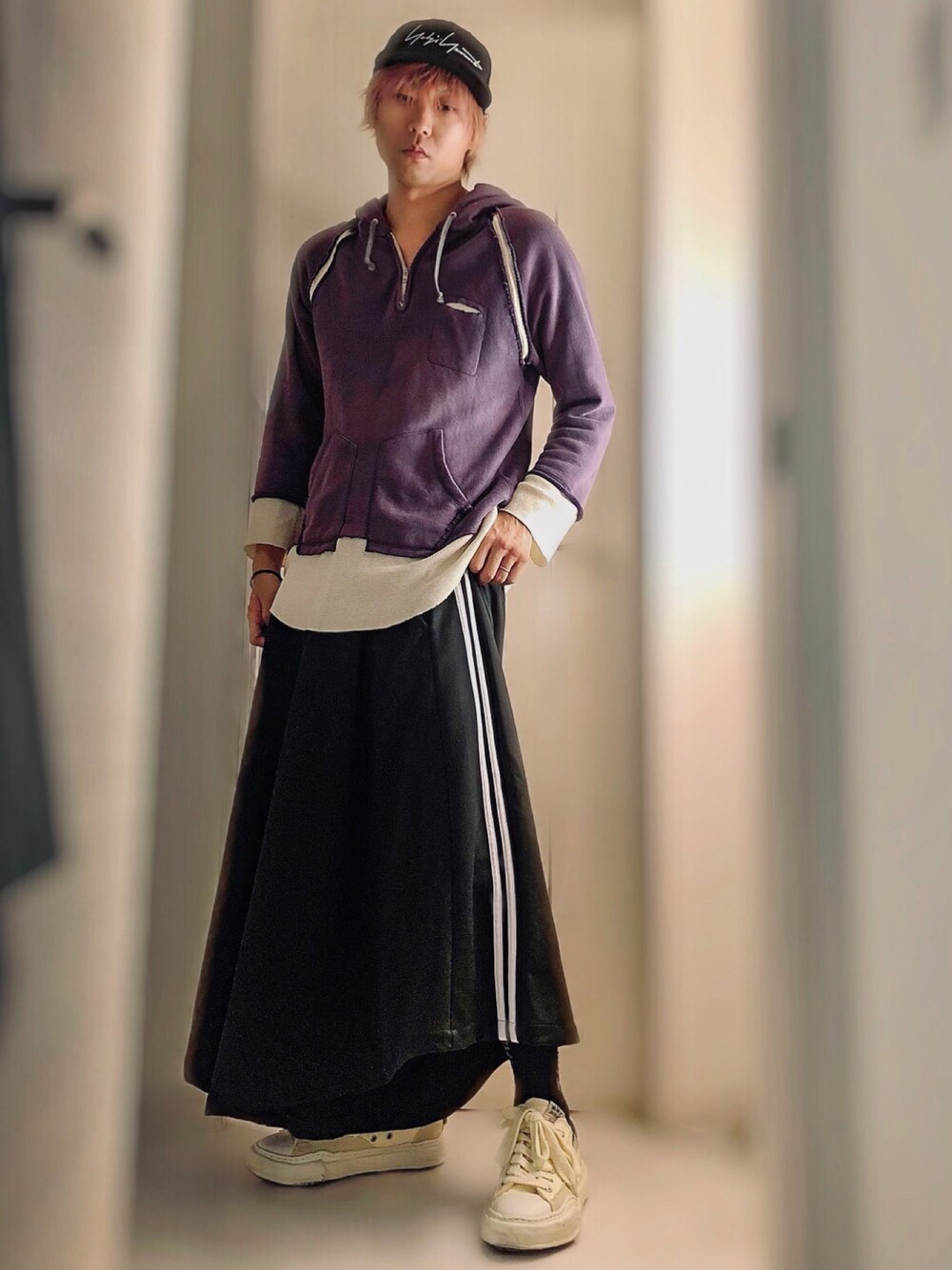 皆さまこんばんわ😊 一応「ストリート」ってとこなんですが。 やっぱ自分っぽくしないと気が済まない、ってか意味ないよなぁ〜て。 使いやすいコーデとか他の人がやってくれるしね🤗 僕なりに自己分析すると、 「ロック」 「ストリート」 「モード」 ってのをなんだか上手いこと混ぜるてAラインで「ど〜ん」ってパンチ効かす、みたいのが好みらしいです。どうやら。 さて、WEARでは初めて載せるアイテムなんですが。 トップスはAZUMA.(アズマ)ってブランドのパーカーです。 UNDERCOVERとかやってた方のブランドですね。 形が気に入ってだいぶ前に買ったんだけどそんなに着てなかったんですよね。 パンツはジャージっぽいデザインの袴パンツです。 青文字系が好きな女子には定番かと思いますがFUNKY FRUITのものですね。 けっこう好きなんで何着か持ってます。 あっちこっち組み合わせるのが好きなんだよね😍