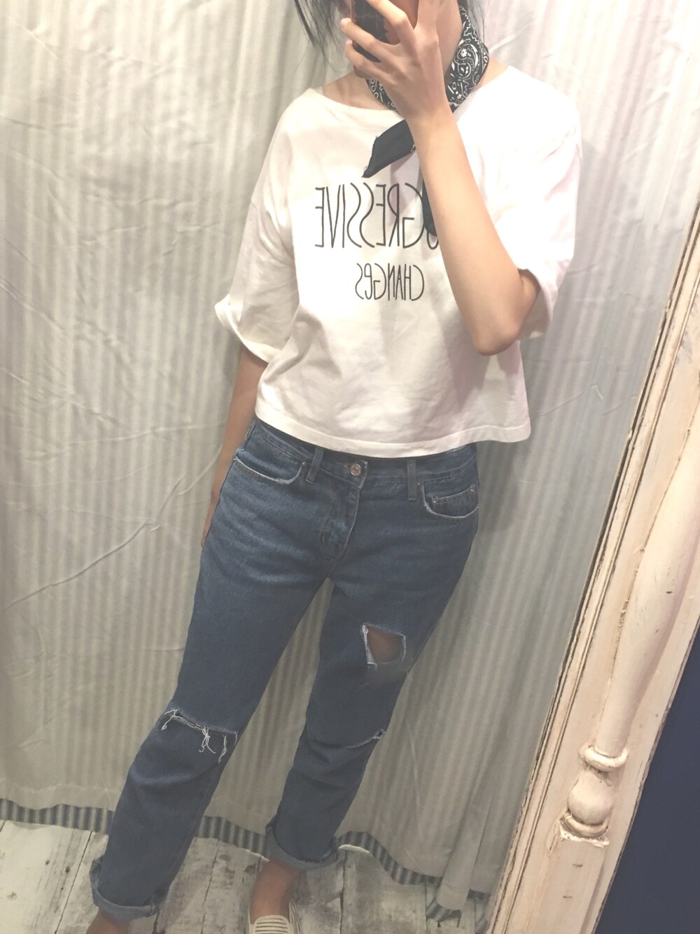 ブルー系のデニムパンツを着用したレディースの夏コーディネートの1枚目の写真