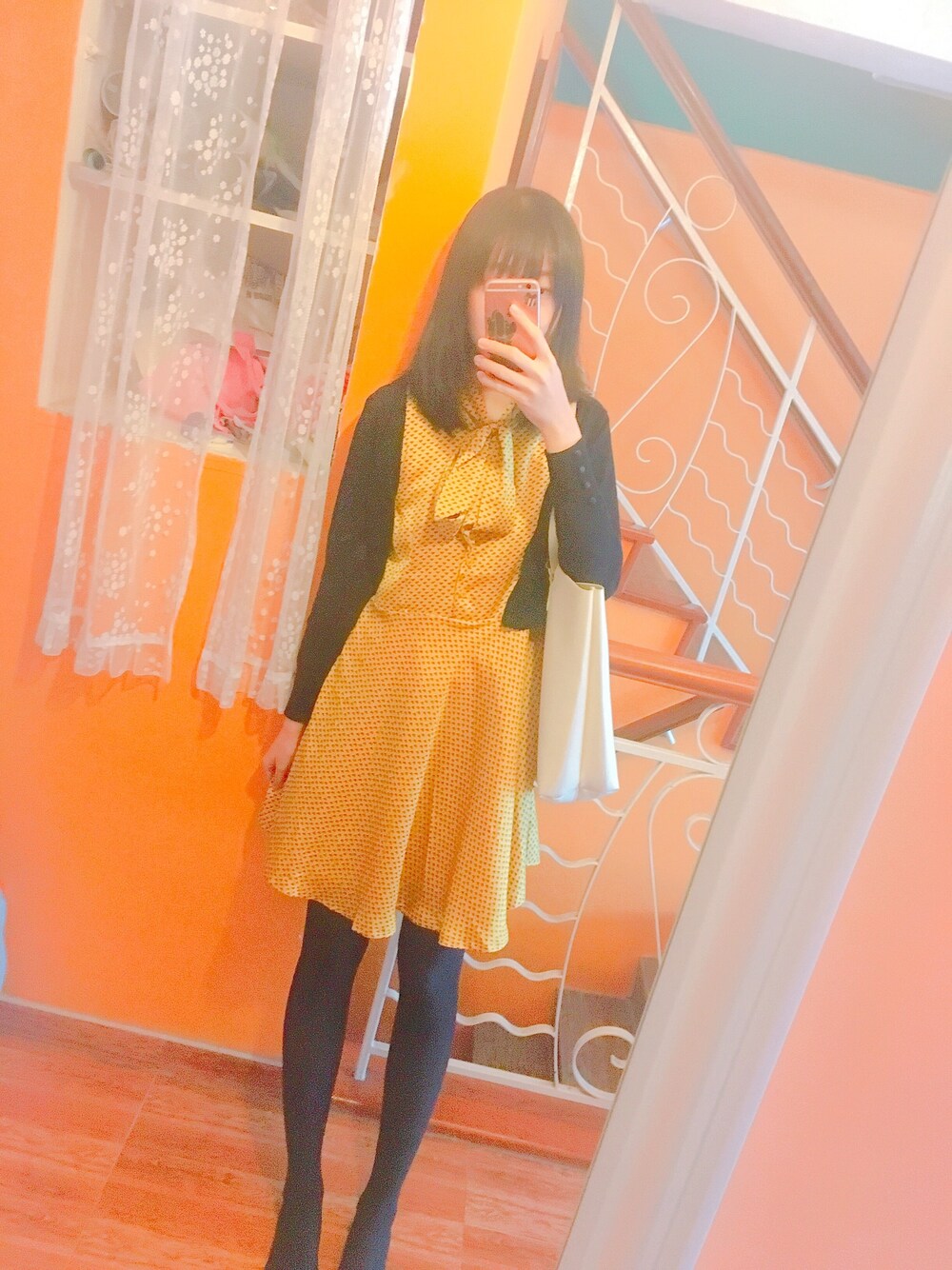 イエロー系のワンピースを着用したレディースの春コーディネートの1枚目の写真