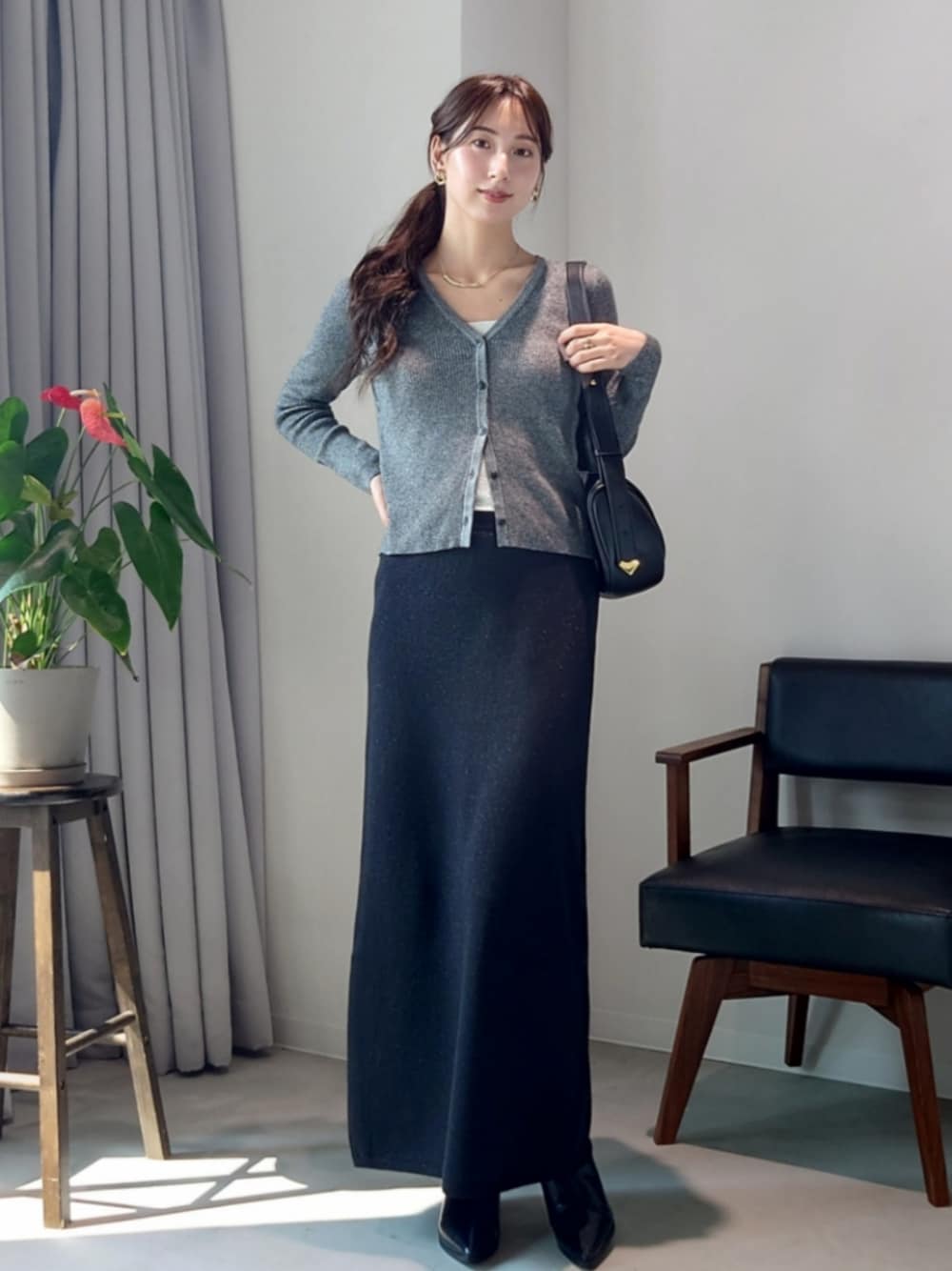 きれいめなVネックのカーディガンに ナロースカートを合わせたコーデ☺️ このスカート、実はラメでキラキラするの…!可愛い✨️