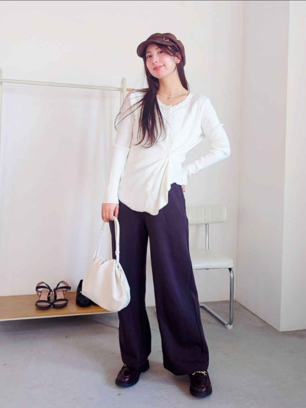 ブラウンのスウェットパンツで楽々なのに 小物たちでキレイ見えに✨️ フェミニンさをプラスできるキャスケットお気に入りです🫶🏻