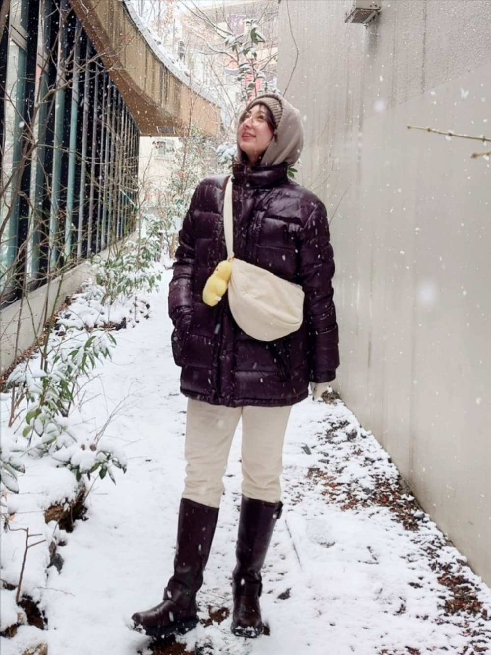 裏起毛のスウェット上下に ニット帽とあったかダウンで完全防寒⛄️🤎 バッグに付けたチャームはmojojojoです🐥✨️