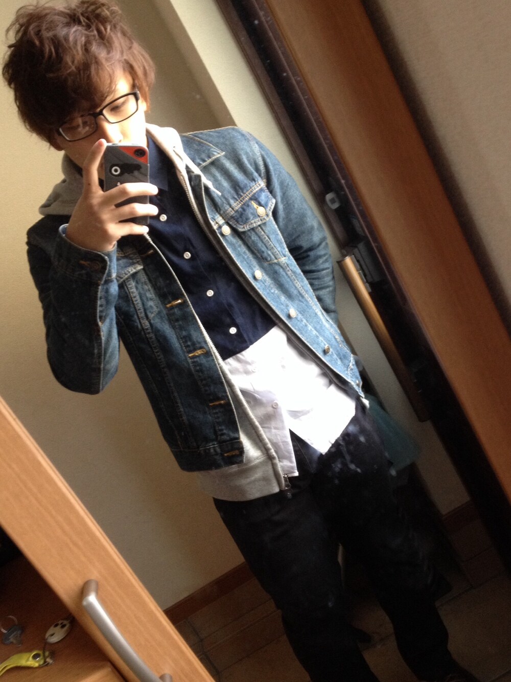 イメチェンの伊達メガネ。 Gジャン (WEGO) バイカラーシャツ (WEGO) パーカー (UNIQLO) パンツ (GLOBAL WORK)