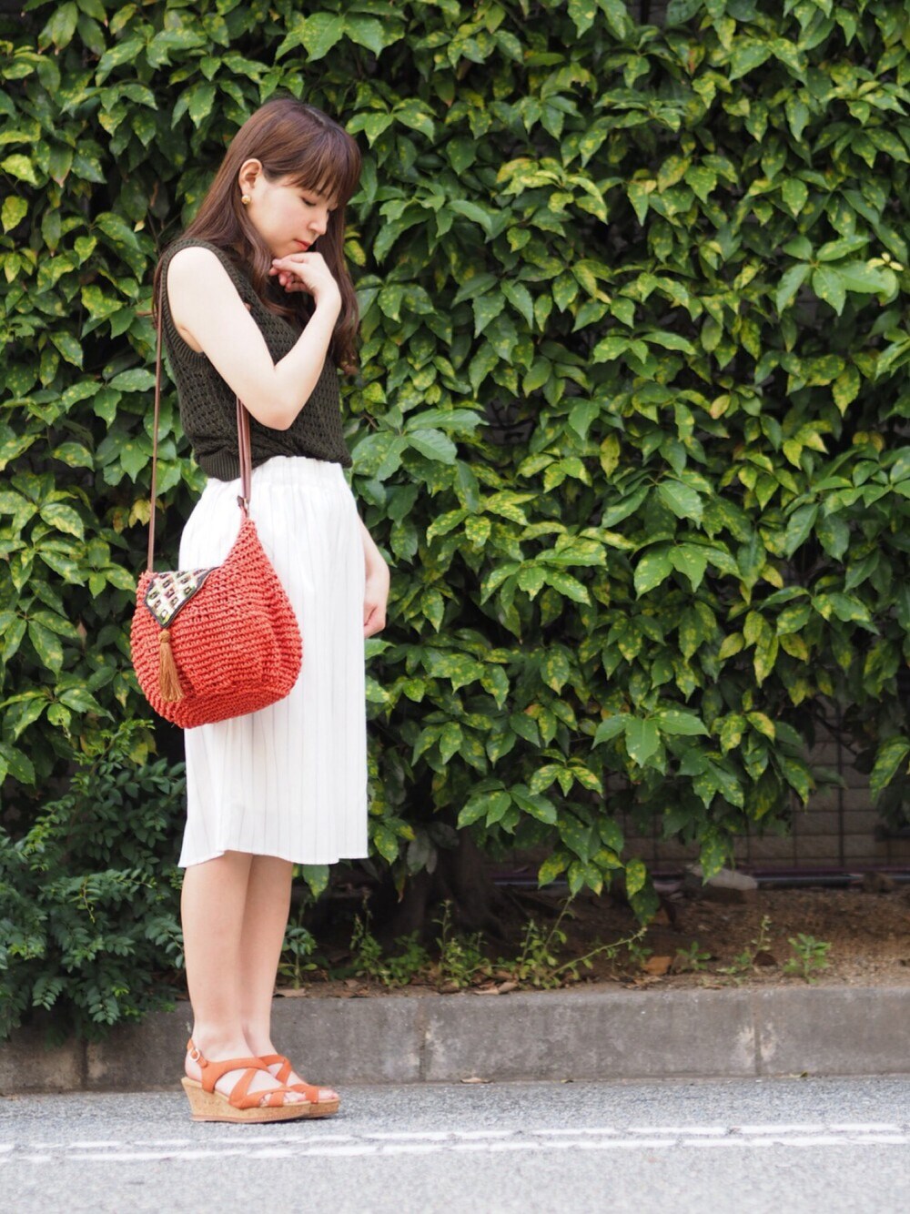 夏のお嬢様ぽいコーデ(笑) ガウチョもニットベストも大人しめの色なので オレンジの鞄と、サンダルで夏らしく! 外で友達が撮ってくれました!!😊✨