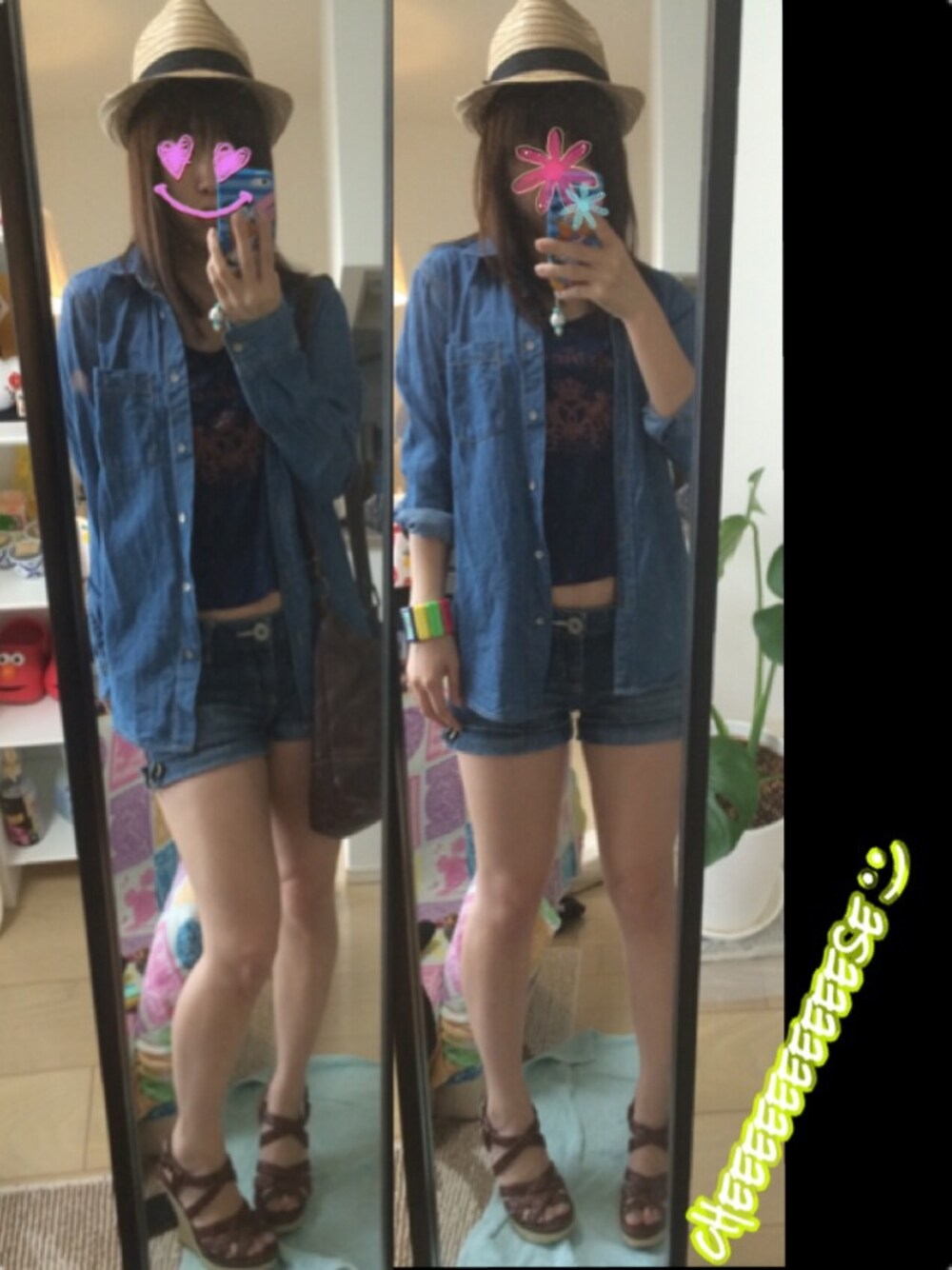 本日3パターンのデニショーコーデを 上げてみましたが、 これが1番好きです♡ むちむちの腹チラ見せ(笑) このカッコに合うカバンの 正解がわかりませんでした(・_・;