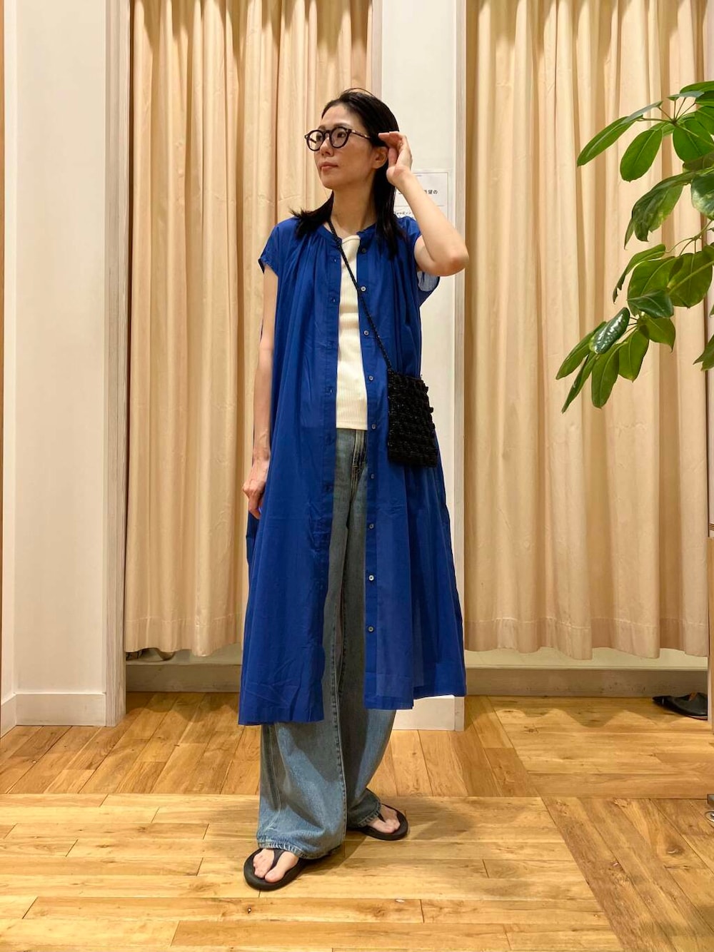 ボタンを開けて羽織物として着ると抜け感が出て雰囲気も変えられるコットンボイルワンピース。夏らしいブルーは着映え効果も抜群です◎ ぜひ、店頭にてお試しください。