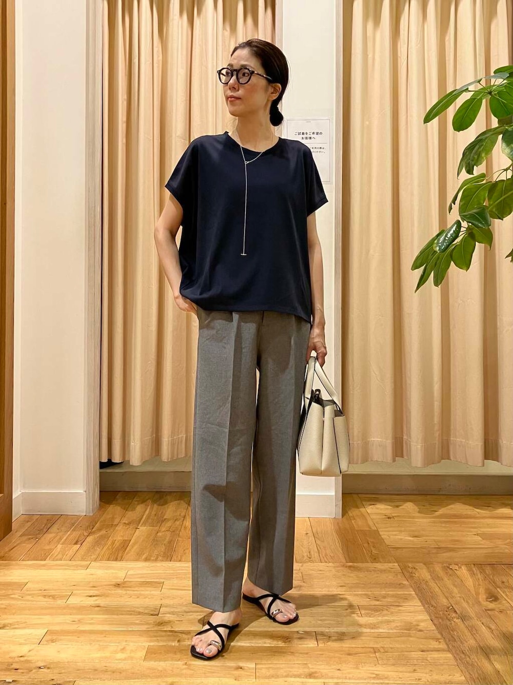 程よいゆとりと丈感で、体型カバーにもなる定番人気汗染み防止ドルマンTシャツが再入荷しました!生地が薄くて涼しさも兼ね備えたきれいめTシャツです! スラックス調のパンツとオフィスカジュアルコーデにしてみました。 ぜひ、店頭にてお試しください。