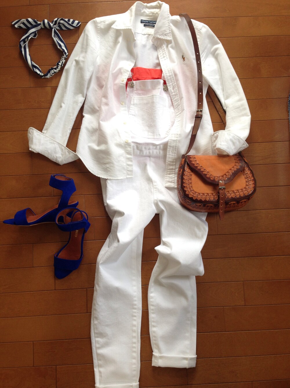 オックスフォードシャツ Ralph Lauren チューブトップ PEYTON PLACE サロペット Dholic ヘアアクセ Top Shop バッグ (ノーブランド メキシコで購入) サンダルはROSE BUDの今年の新色バージョンです。