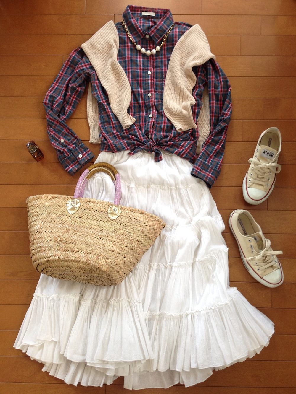 チェックシャツ GU(790円) ニット GU(790円) スカート ハリウッドランチマーケット GU激安Outfit! 家のそばをウロウロするには、最適だ〜。