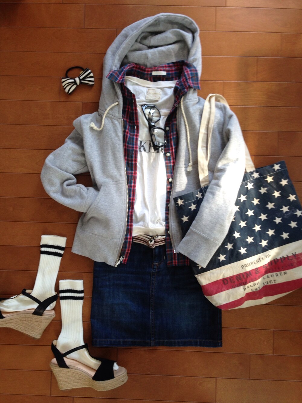 Tシャツ 忘れた。 チエックシャツ GU パーカー アメリカンラグシー デニムスカート GAP シューズ AU BANNISTER エコバッグ DENIM & SUPPLY 明日はHey! Say! Jump!のコンサート。 「チケットが激安になってるよ。」 「へ〜、いくら?」 「1000円とかだって!」 「安っ!行っちゃうか〜。」 的なノリで行くことになったけど、 こんなコーデでいいのかな? 楽しみ〜♩