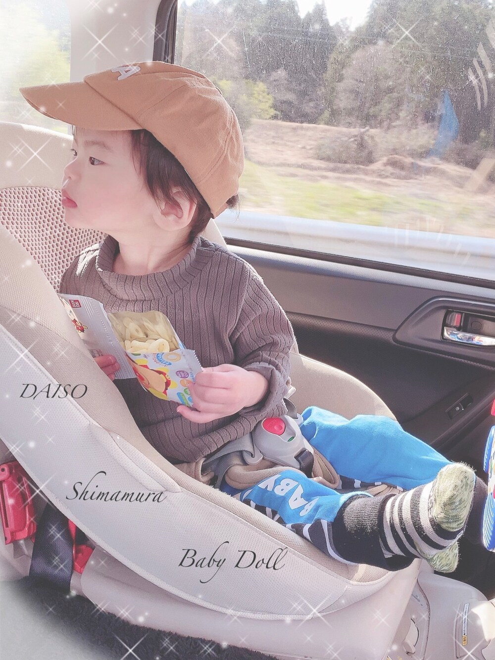 チャイルドシートにて♪ 春コーデ☆ 水色×キャメル?ベージュ? も好きな組み合わせ!! 男の子っぽくて◎