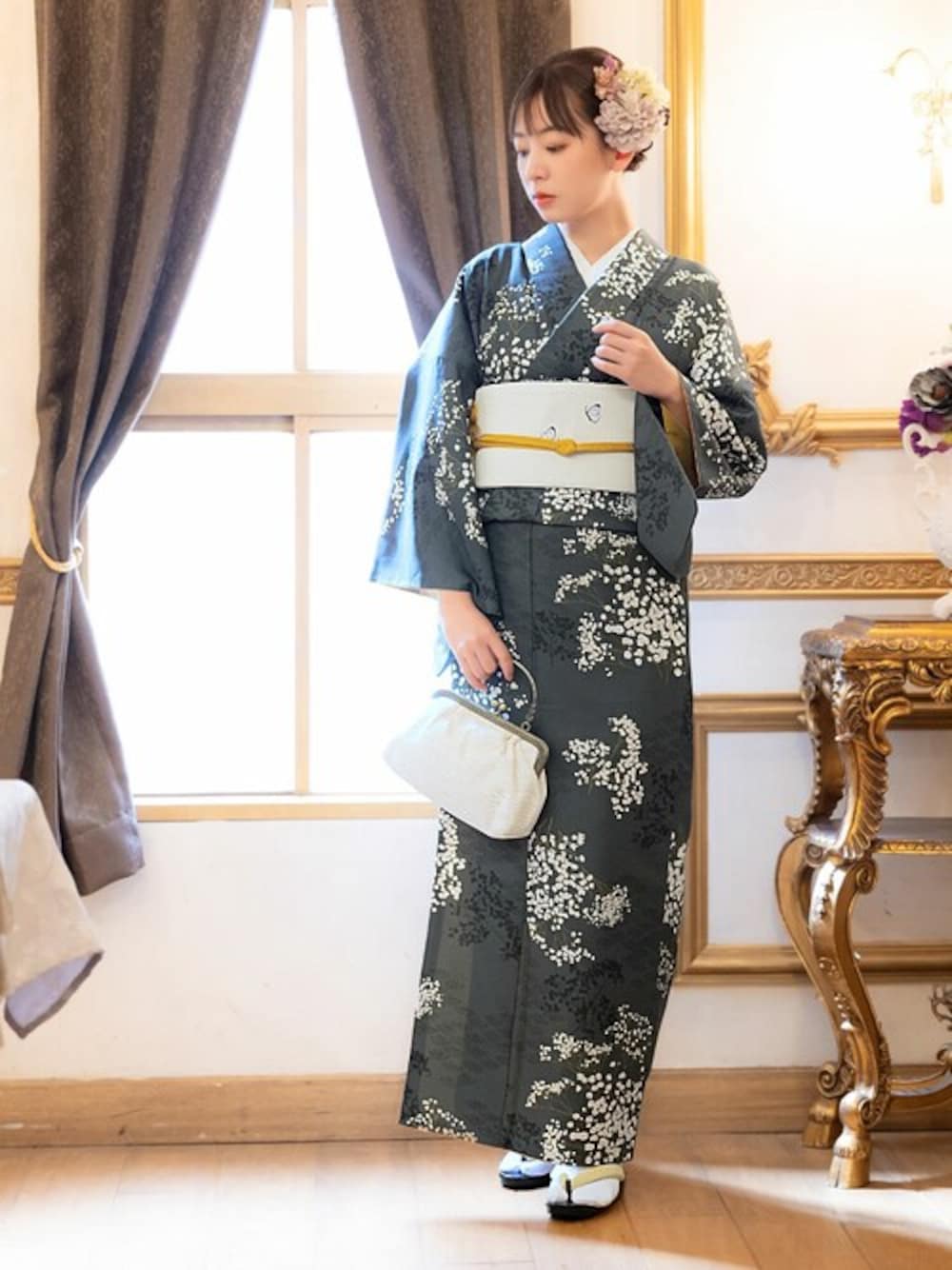 KIMONOMACHI(京都きもの町)の着物「レディース 洗える着物 単品 袷着物 M/L サイズ かすみ草に青海波シリーズ KIMONOMACHI オリジナル 着物単品 小紋」を使ったコーディネート