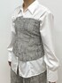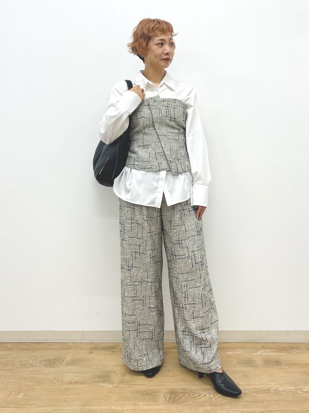 【シャツ】 ▼着用コメント 肩幅広めな体型ですが、肩周りは窮屈感なく着れました。着丈はそのまま着ても長すぎることなく、ニットのレイヤードなどにも重宝しそうです。袖はやや長めでした。 【ビスチェ】 ▼着用コメント 骨格ナチュラルで胸周りの肉付きは薄めなので、ビスチェは下がってきてしまうものもありますが、後ろのゴムがしっかり入っていたたので安心でした。生地は見た目よりやわらかめで、窮屈感や締め付け感はありませんでした。 【パンツ】 ▼着用コメント 通常サイズ→38 着用サイズ→38 骨盤広めの体型で、38を履くことが多いです。全体的にゆったりめのシルエットで、ヒップ周りもラインを拾いません。丈は身長159cmでフラットシューズだとやや長めでしたが、ヒールを履いてちょうど良い長さでした。 【シューズ】 ▼着用コメント 通常サイズ→37か38 着用サイズ→38 幅広甲高のため、38を履くこともあります。こちらは37です。かかとにゴムが入っていてややタイト目に感じるので38を選びました。甲が深めのパンプスなので、ブーティのような雰囲気で履けます。 アウトソールの屈曲がよく、フィット感の良いシューズです。 【バッグ】 ▼着用コメント 柔らかく軽やかなレザーを使用しており、普段使いからお仕事まで幅広くお使いいただけます!A4が横に収納可。 ショルダーの編み込みデザインがおしゃれです。ファスナーの引き手が長いのも実用的かつ、シャープなデザインでおしゃれです!