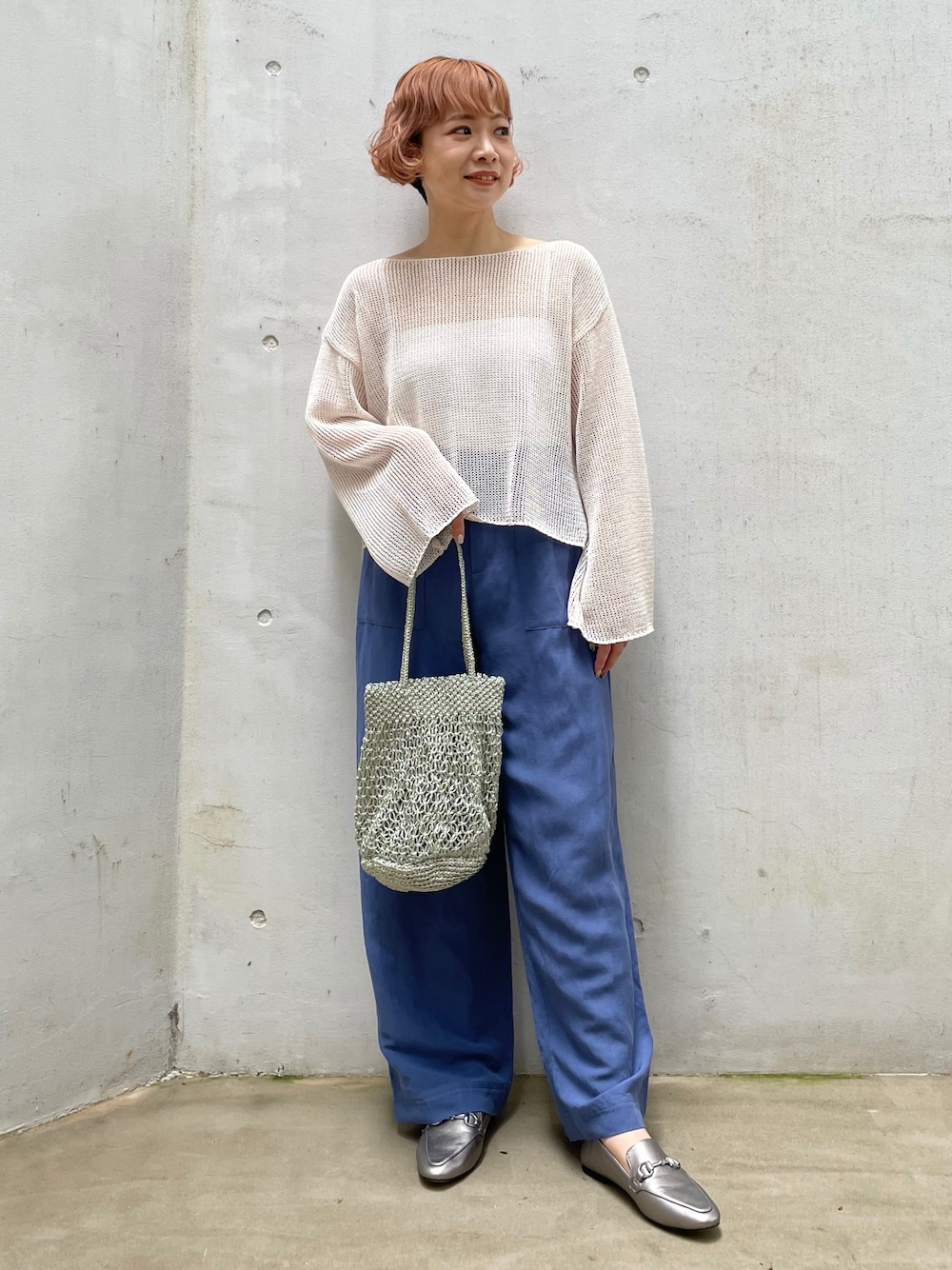 159cm/40代/イエベ春/ナチュラル トップス : M 肩幅あり ボトム:MかLで迷う 骨盤広め 足サイズ : 37(23.5cm)か38(24cm) 足の特徴 : 幅広・甲高・スクエア型 【シアーメッシュペーパーニットプルオーバー】 ▼着用コメント 着用サイズ→フリー サラッとした風合いの素材で、蒸し暑い時期でも肌にまとわりつきにくいです。 着丈は後ろがやや長めで、サイドスリット入りなので、そのまま着てもバランス良いうえ、動きやすいデザインです。袖にやや広がりがあり、シンプルな中にも女性らしい雰囲気があります。 【レーヨンリネンベイカーイージーパンツ】 ▼着用コメント 着用サイズ→38 麻混で軽くて清涼感があります。レーヨンが入ることでしっとりした素材になっているので、麻独特のシャリ考えて苦手な方にもおすすめです! ウエストはゴム仕様、パンツの太さはやや太めです。腰張りの体型でも楽に履けました。 【ビットローファー】 ▼着用コメント 通常サイズ→37か38 着用サイズ→37 幅広甲高のため、38を履くこともあります。こちらは37です。 かかとに芯がなくソフトな履き心地のローファーです。合皮のため、軽い雨の日のお出掛けにもおすすめです。トレンドに左右されないデザインです。
