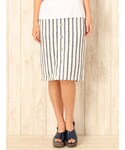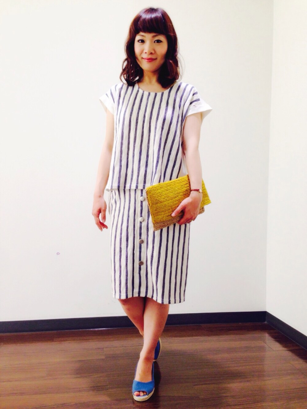 旬のセットアップ。夏らしい素材感がストライプ柄を引き立てます。スカートはサスペンダー付き。