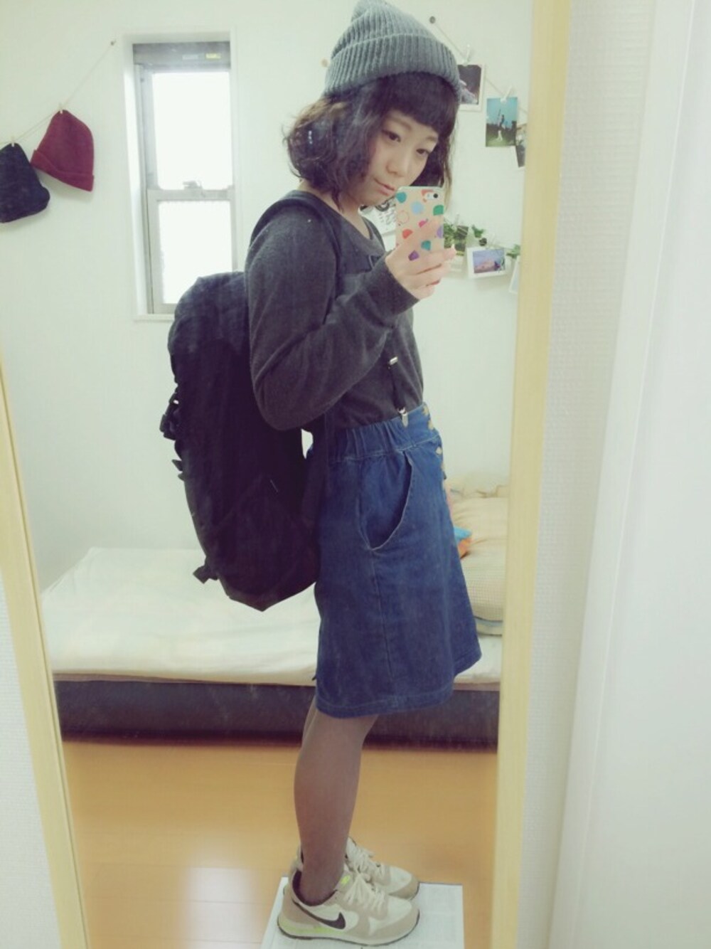 ❁2015.1.18❁ ✱トップス▷RETRO GIRL ✱デニムタイトスカート▷archives ✱タイツ(グレー)▷靴下屋 ✱ニット帽▷Cutie Blonde ✱スニーカー▷NIKE ✱サスペンダー▷spins ✱リュックサック▷NIXON