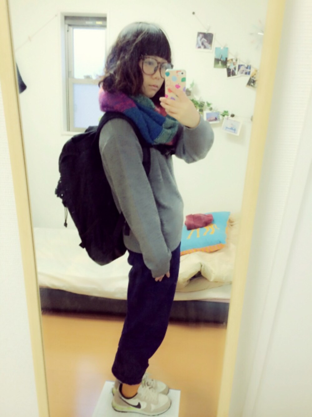 ❁2015.2.7❁ ✱ニット▷もらいもの ✱パンツ▷古着屋さん ✱スヌード▷THE EMPORIUM ✱リュック▷NIXON ✱靴下▷靴下屋 ✱スニーカー▷NIKE ✱だてめがね▷雑貨屋さん この古着屋で買ったパンツ実は500円 🐘 激 安 。