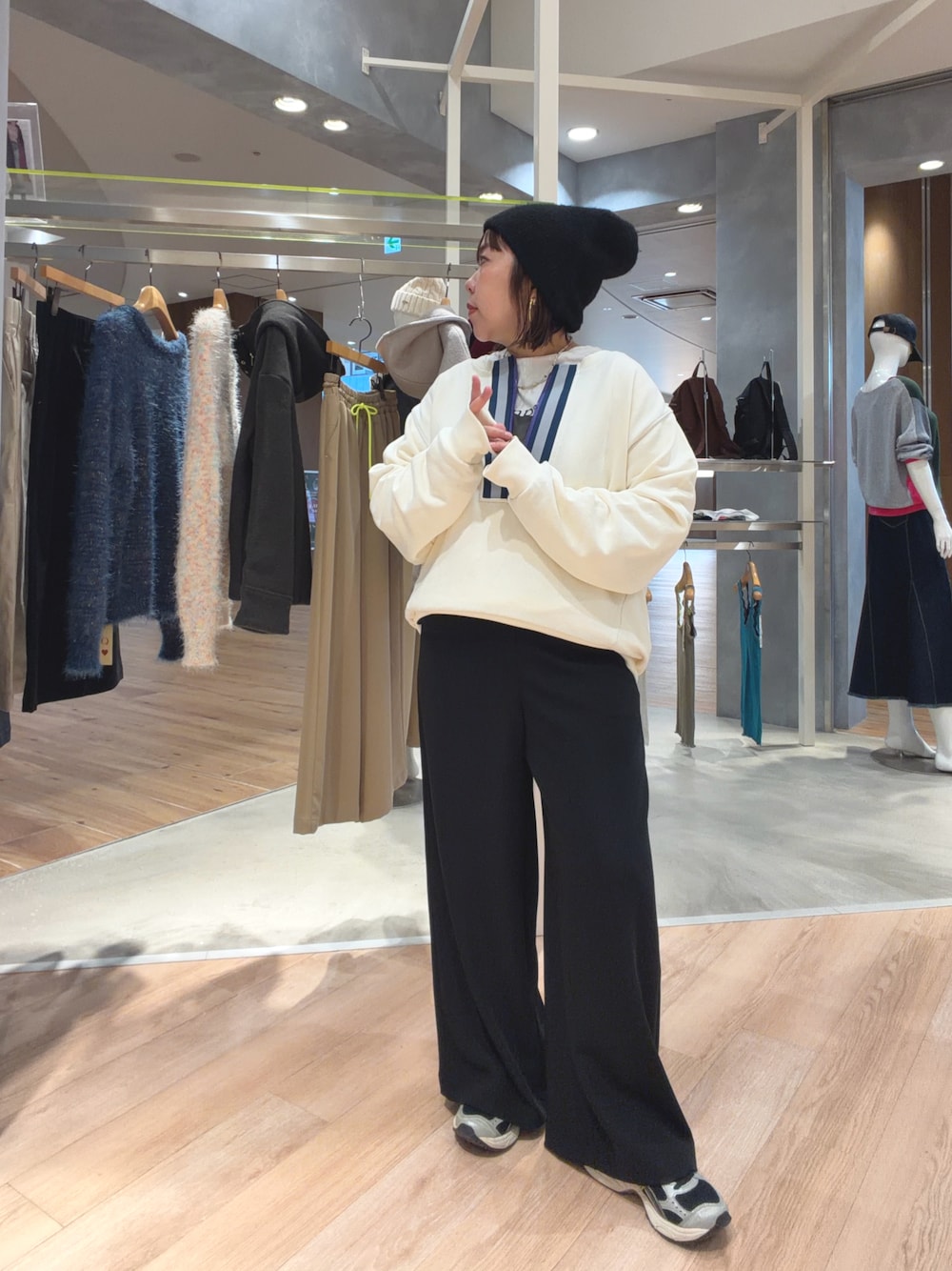 カラーのリブとファスナーがポイントのスウェット。深く開けも閉めてもどちらでも可愛い! 気分はロンT合わせなのでロンTをチラ見せ♪