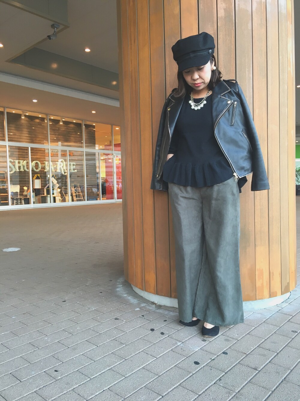 ワイドパンツとライダースでハードめなコーディネートにフリルニットで女子らしさをプラス☺︎