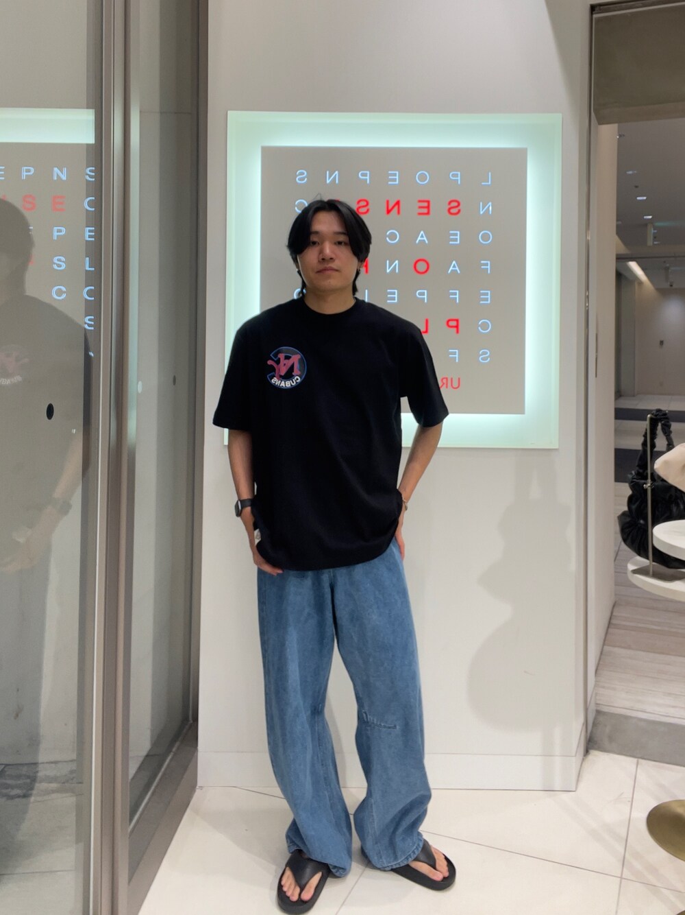 アイテムはTシャツにデニム、サンダルというシンプルな組み合わせとなっております。 デニムはカーブを描いており、他にないデザインとなっております。