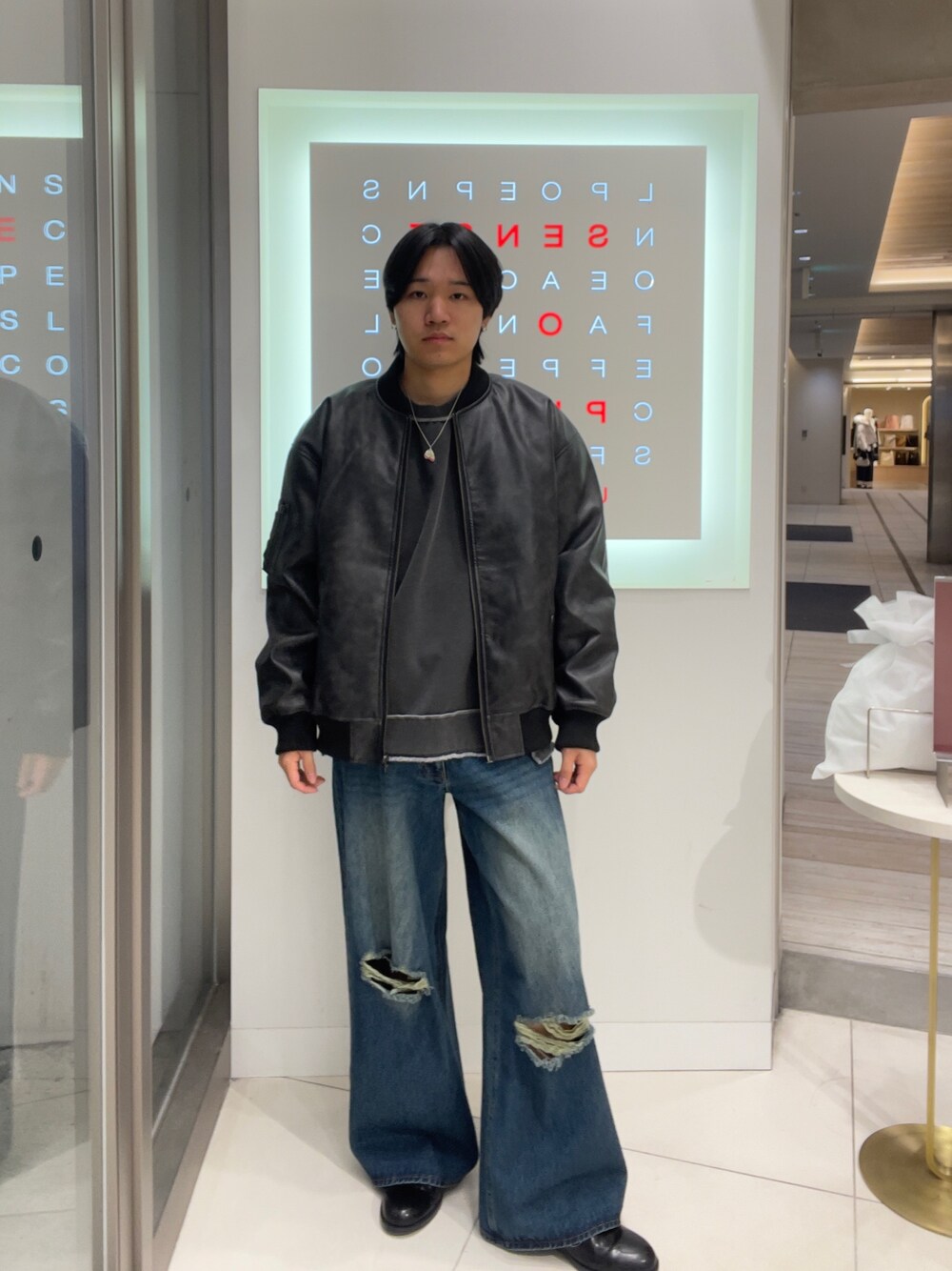 インナーとパンツは加工がされており、レトロな雰囲気があります。その上にMA-1を着用することで、古着感も彷彿とさせています。