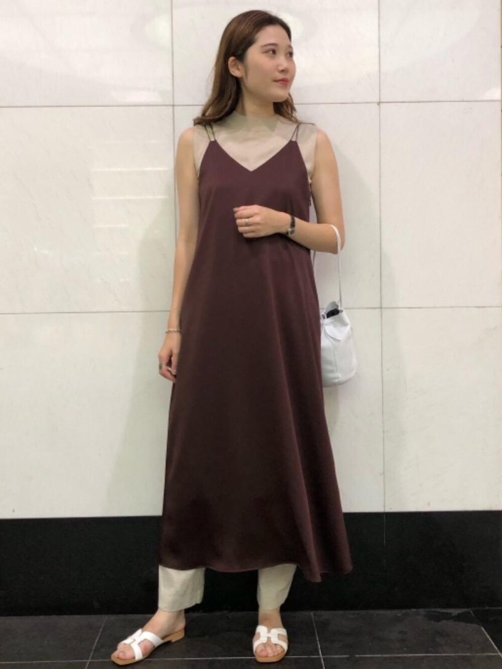 サテンキャミワンピースは、サイズ感を大きめにしてカジュアルダウンするために38サイズを着用してます。 一枚でさらっと着てもいいですし、パンツ合わせしてリラックスした雰囲気で着ることもできます。