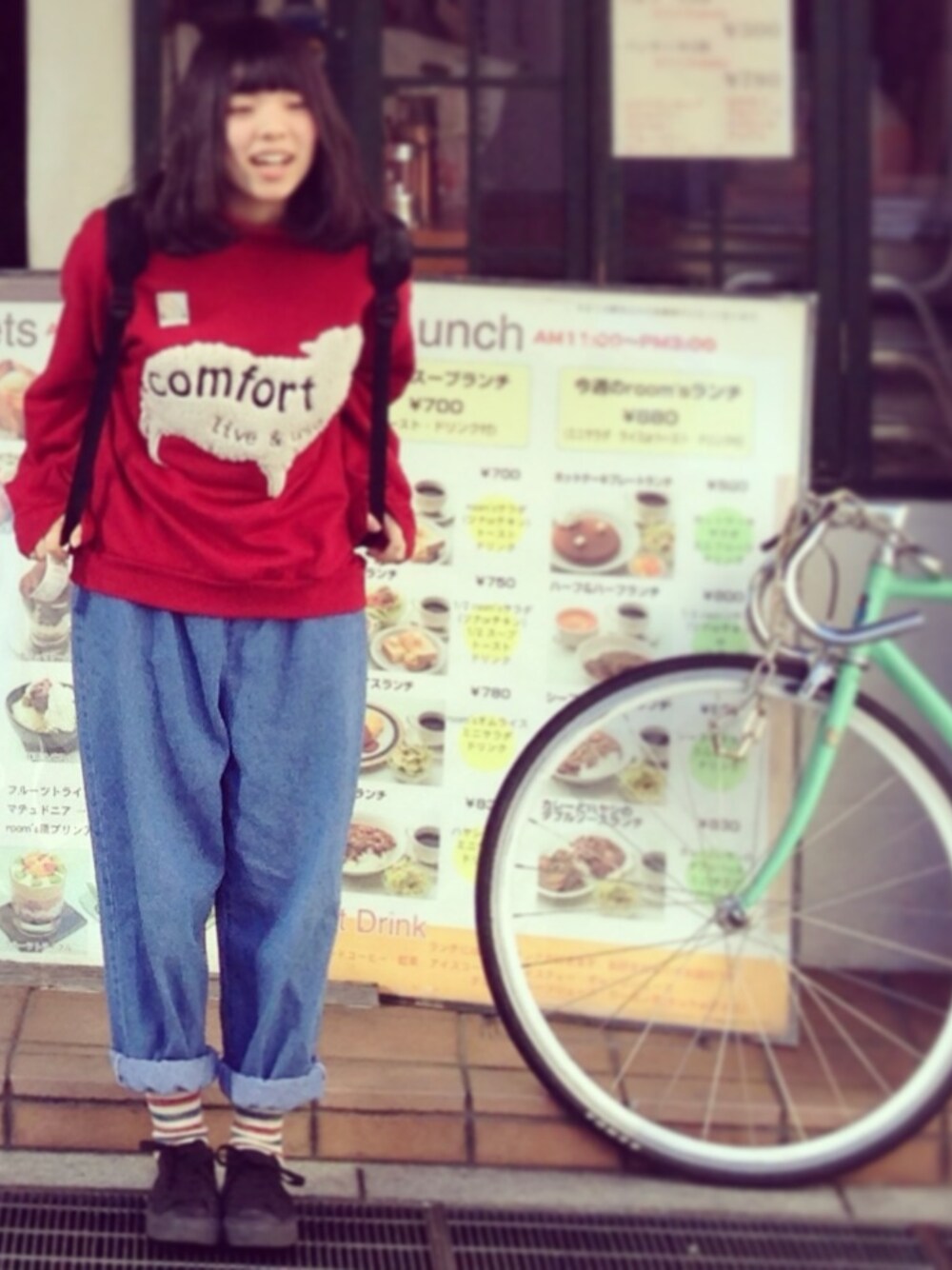 羊ちゃんスウェット:スピンズ 古着デニムパンツ:スピンズ ブローチ:道楽市