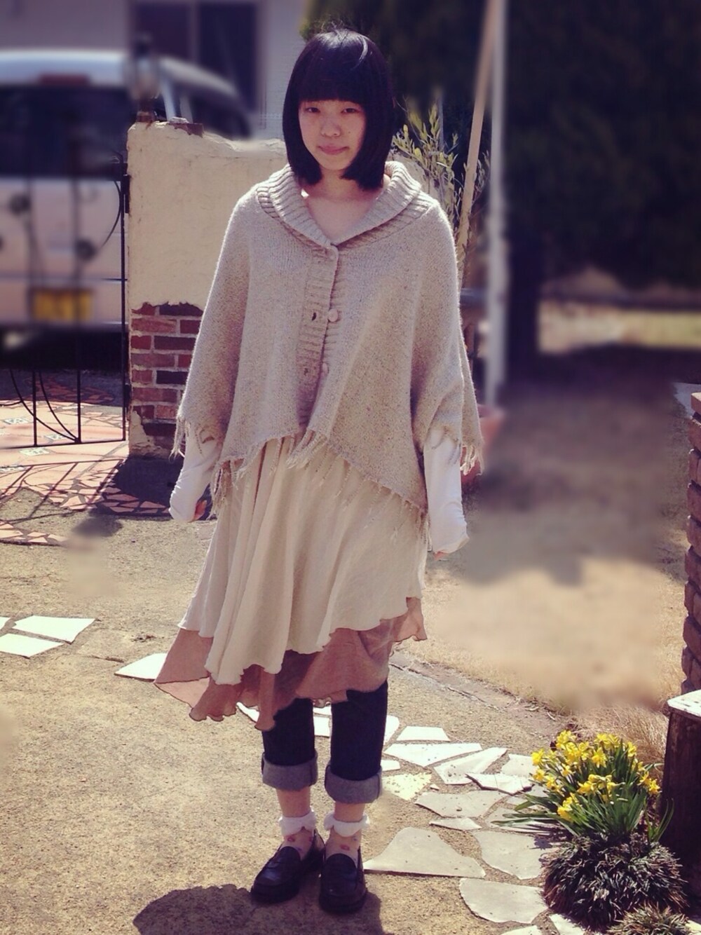 古着コーディネートです 私服でローファー履くのは初めてです◎! Heather ポンチョ 古着 ワンピース 古着