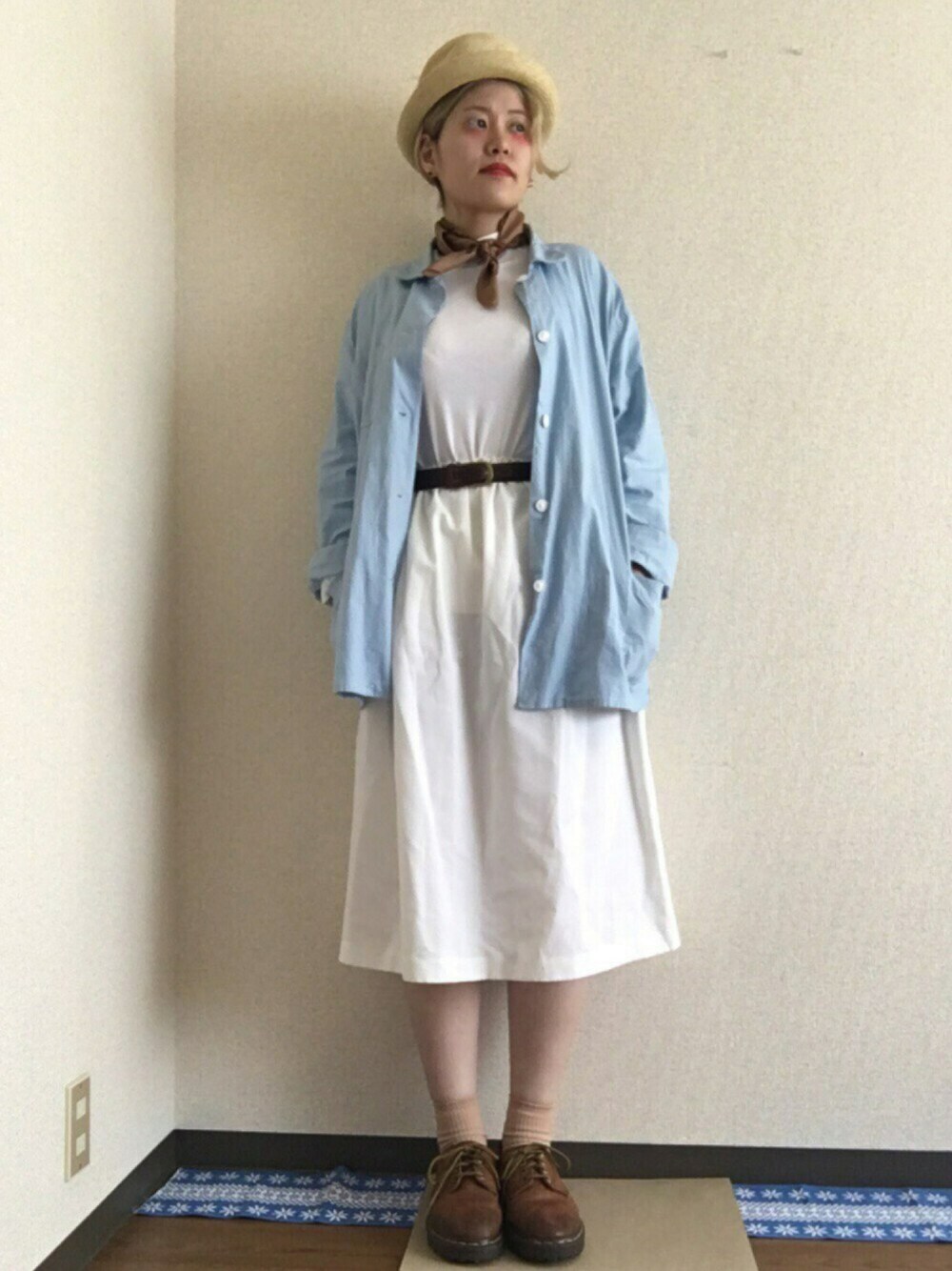 爽やかコーデ ◯ スカーフとソックスをベージュにして大人っぽさを。 ラウンドカラーのシャツはレースのボタンで可愛らしいです。