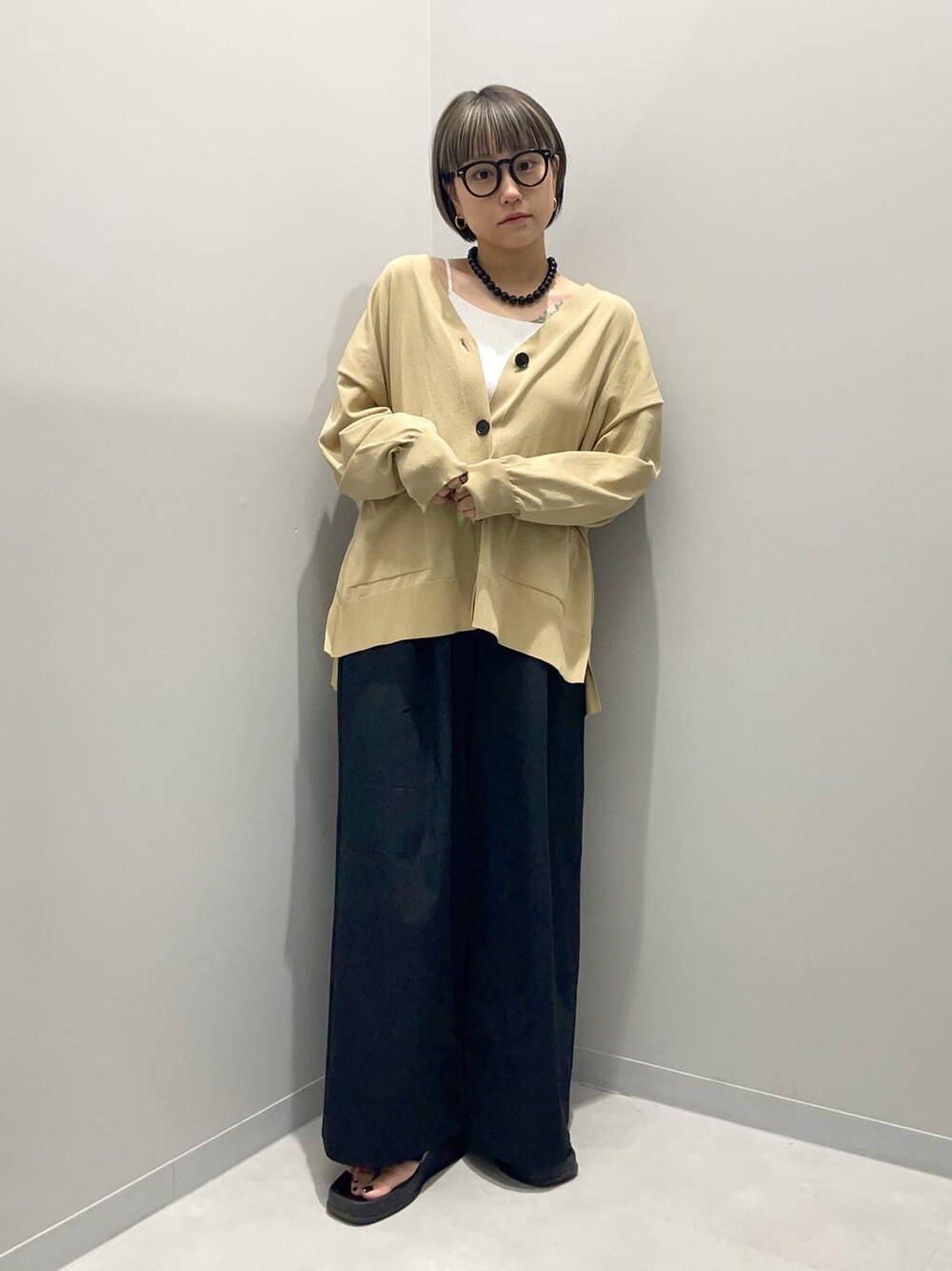 kinaco(GLOBAL WORK Smile Seed Store イーアス高尾)のカーディガン/ボレロ「スッキレイさらさらVネックカーディガン長袖/288073」を使ったコーディネート