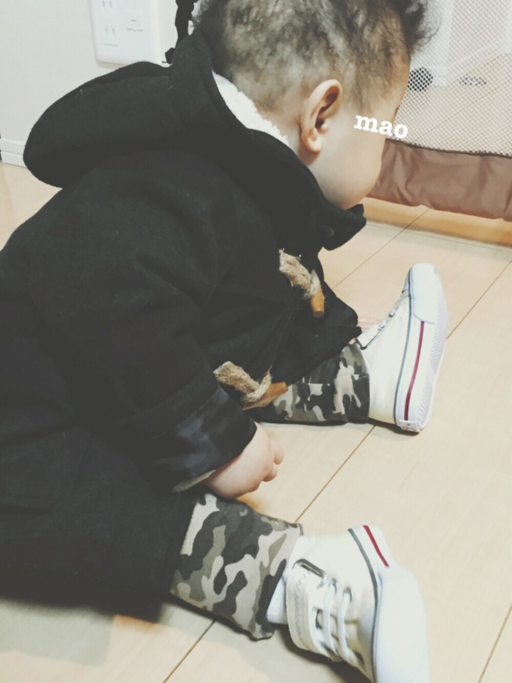 お友達に貰ったディズニー土産のベビーシューズを防寒のため、初卸し! まだ歩きません&-|