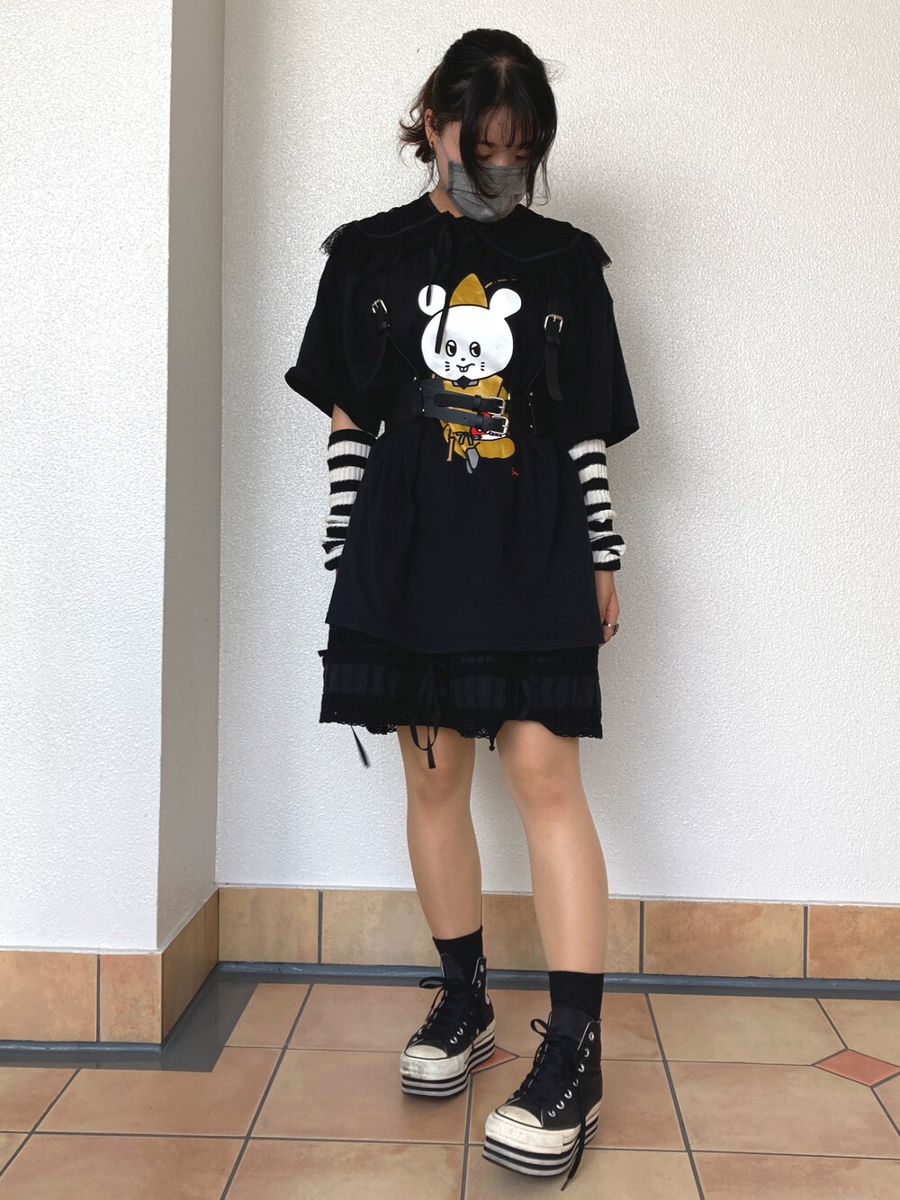 アームカバーを目立たせたくて合わせてみたら真っ黒に キュウソネコカミの派手Tが付け襟でおとなしくなったような ハーネスベルトはスタイルアップしてくれるから好き