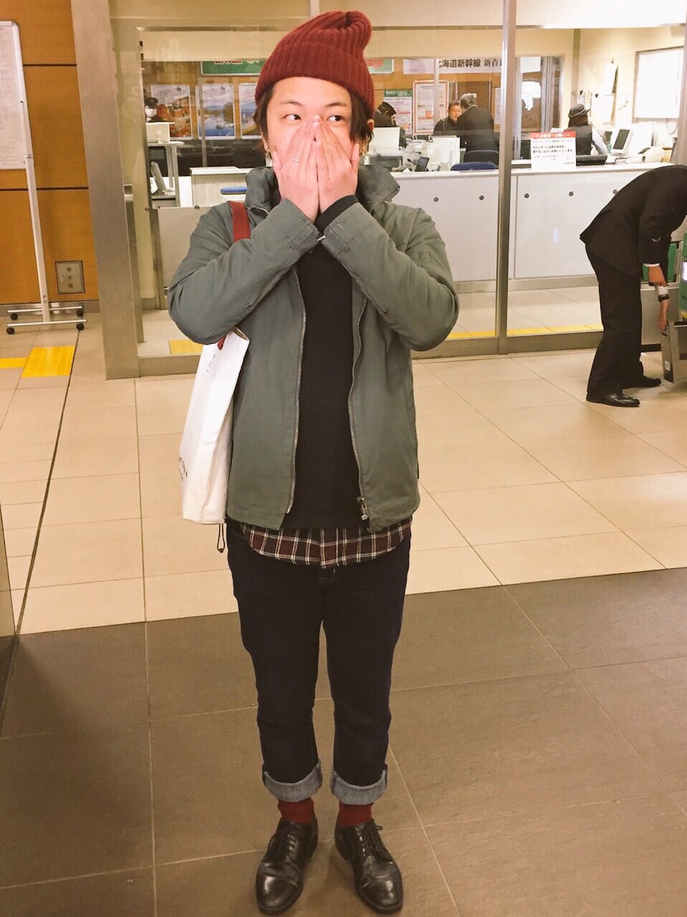 ミリタリーとデニムを合わせたシンプルな服装です。 ニット帽とトートバッグの持つところと靴下とスウェットの下のチェックのシャツの赤を合わせてみました。
