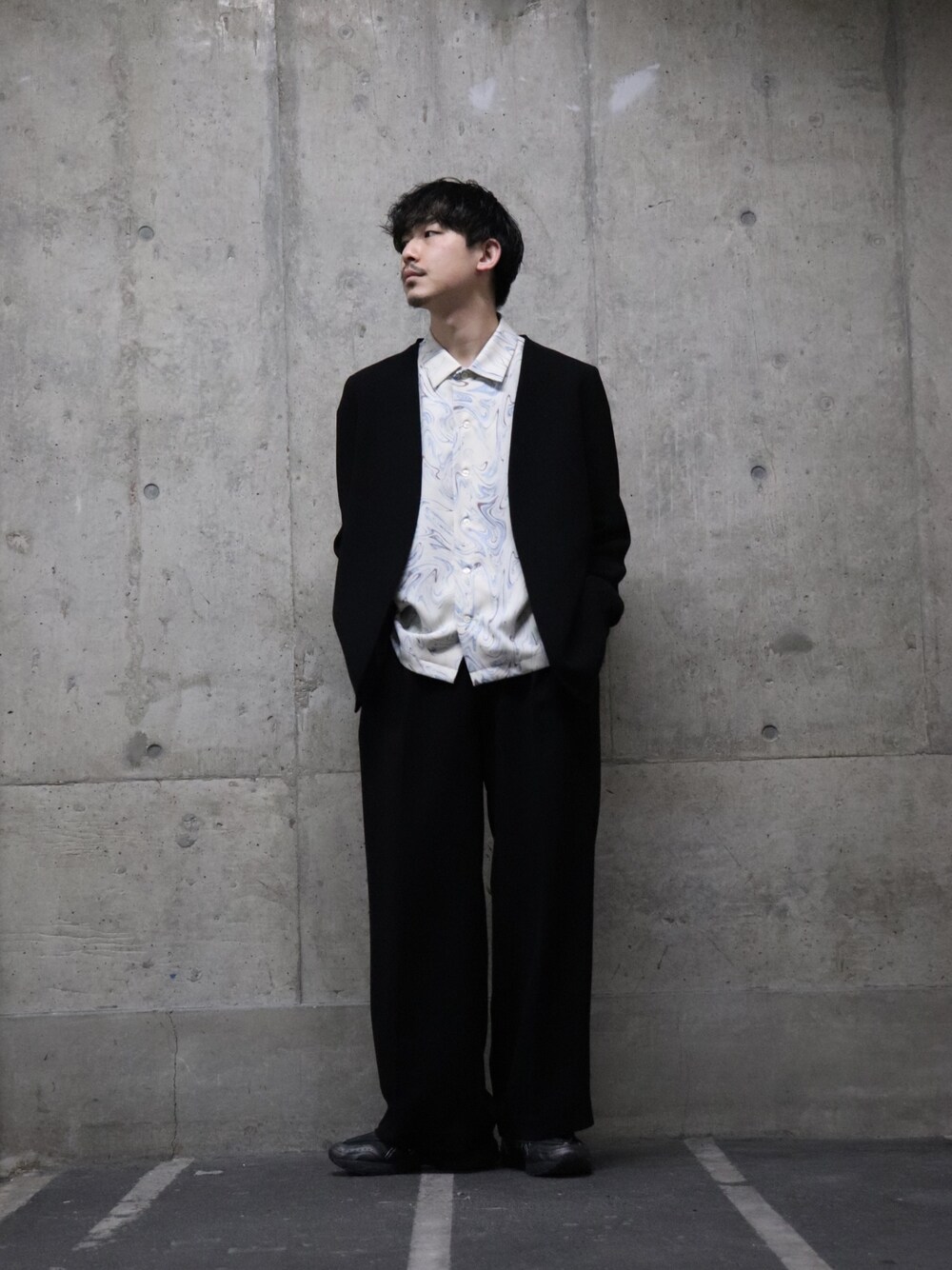 kinchanのテーラードジャケット「【オリジナルファブリック4×4セットアップシリーズ】 ノーカラージャケット」を使ったコーディネート