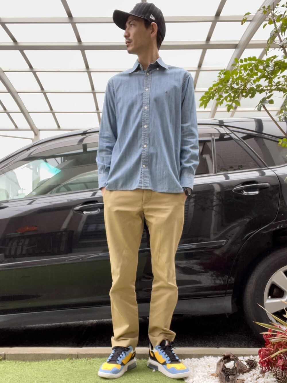 今日は春コーデ 爽やかな色合いを感じさせる為に薄い色のデニムシャツとチノパンを合わせてます。デニムシャツとスニーカーも色合いを似せてモノトーンコーデ風にしてます。