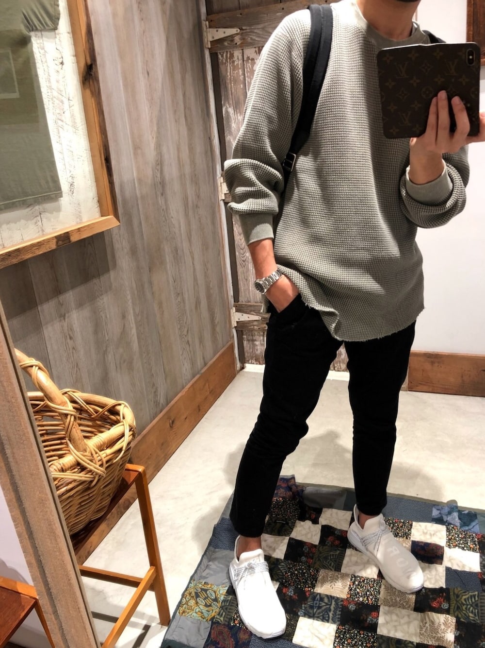 グレー×ブラックの暗めコーデにホワイトスニーカーで明るさを調節