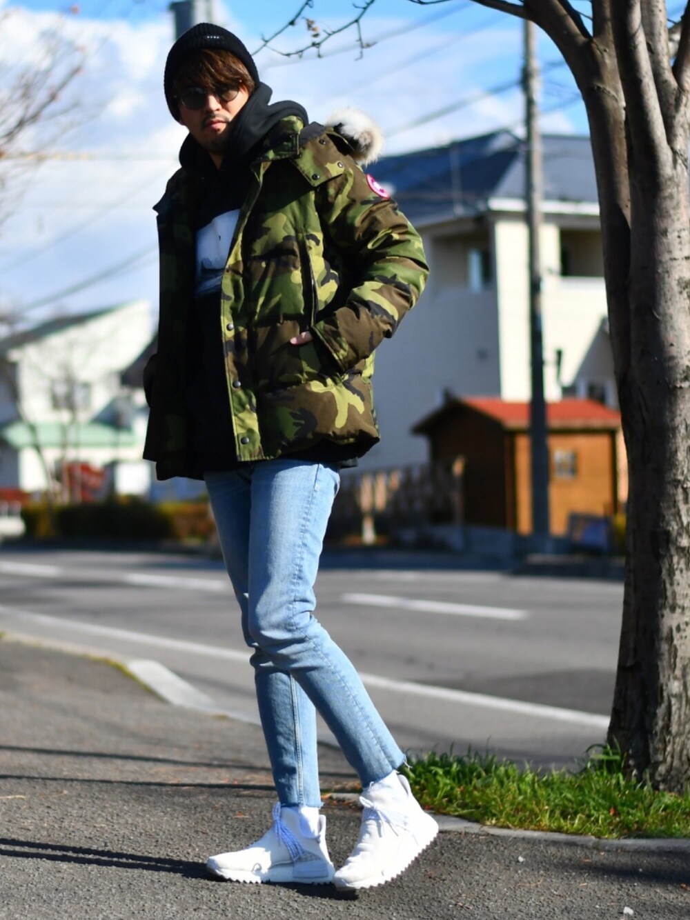 カモフラカナダグースで遊びをプラス ノンダメージデニムでごちゃごちゃにならないようにしました👌