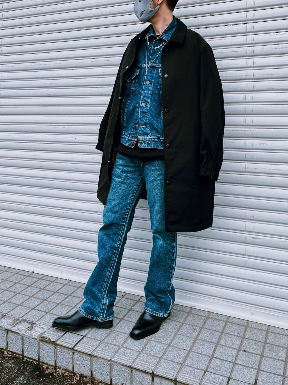 ブルー×ブラック デニムオンデニムにコートを羽織ってちょっとだけ上品さをプラス。 スニーカーと迷ったけどブーツにして正解。