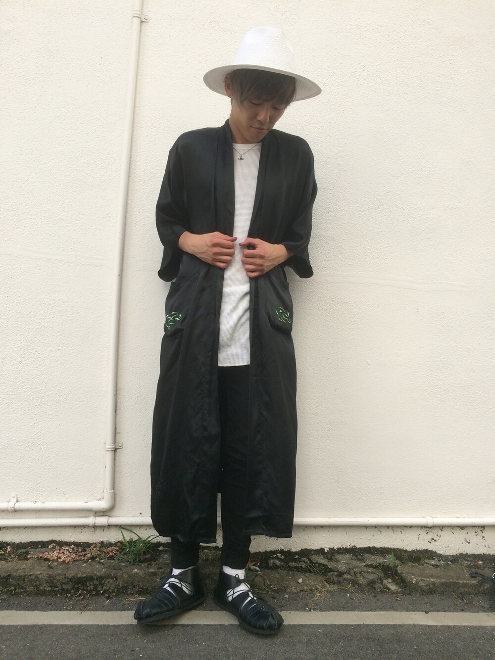 チャイナガウンとレースアップサンダルを使ったコーディネート‼︎ モノトーンでモードに!