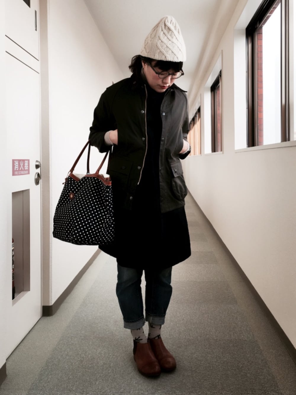 バブアーのコーデ。 中はMHL.のワンピースに無印良品のタートルネックとデニムを合わせました。 朝から雪がチラついてさむい日。 ストールが必要になってきそうです。