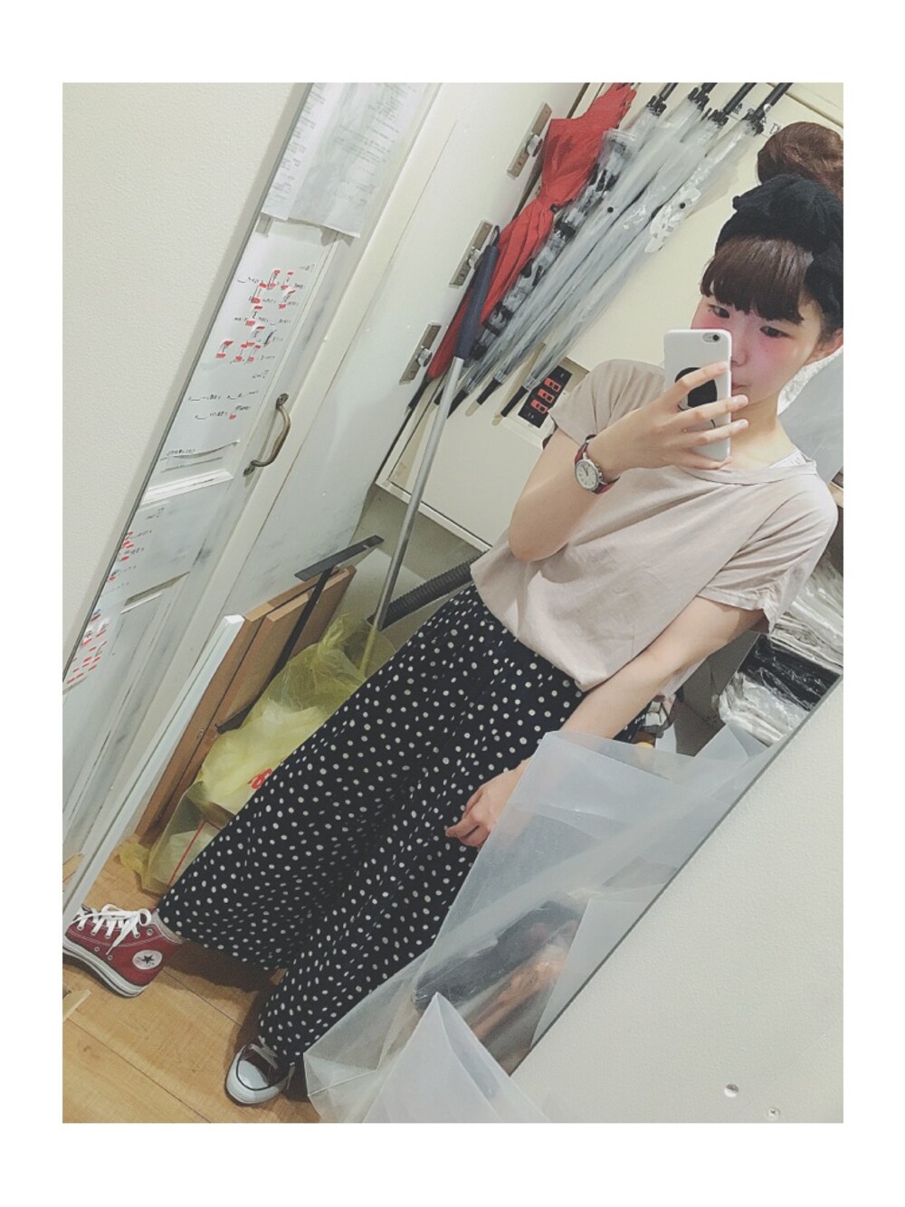 ベージュ×ネイビー×レッド 大好きな組み合わせです☺️ ワインレッドのハイカットコンバースかなりお安くゲットできてるんるんです。
