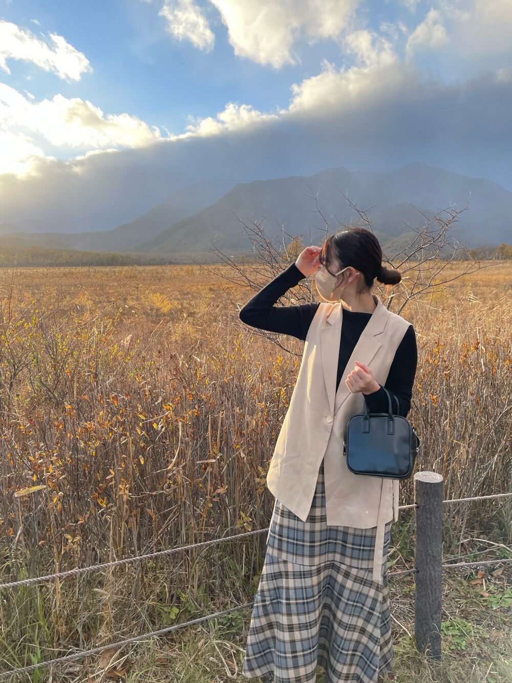 マーメードスカートコーデ🙈 秋らしいチェックのスカートと黒のニットに合わせて大人可愛いカジュアルコーデ^_^