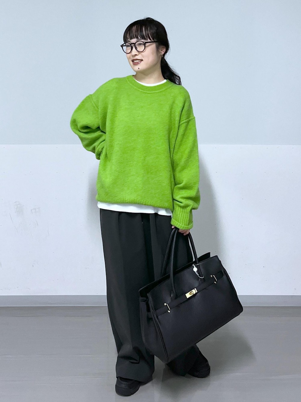 ボトム:Sサイズ シューズ:23cm お洋服がダークになりがちな冬に映える カラーニットが入荷しました! Tシャツをチラ見せさると垢抜けたカジュアルに。