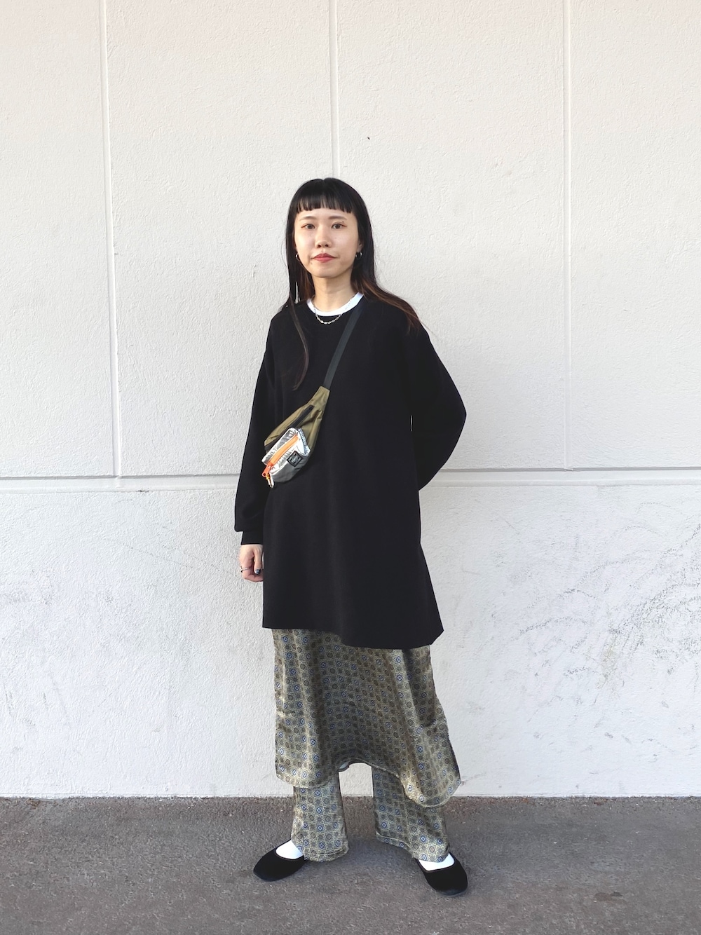 バックデザインがかわいいニットプルオーバー。小紋柄のセットアップにあえて被せて着てみました。やっと重ね着できる気温になってきたので、レイヤードスタイルで色んなバランスでも楽しめそうです。 ▷ミラノリブバックオープンチュニックニット サイズ感:腰回りまでしっかり隠れる着丈。袖にボリュームがあり、全体的にゆるめ。 着心地:着ていてとても暖かい。中に着込めるので、真冬にも余裕で着れます。 ▷サテンプリントキャミワンピース サイズ感:ストラップで長さ調節可能。159センチで詰めて着てこの丈感です。 着心地:落ち感のある素材で、レイヤードにもおすすめです! ▷プリントサテンフレアパンツ(Sサイズ着用) サイズ感:腰回りもジャストサイズですっきり。フラットシューズでもギリギリつかない丈感。 着心地:つるとした生地できれい見えします。
