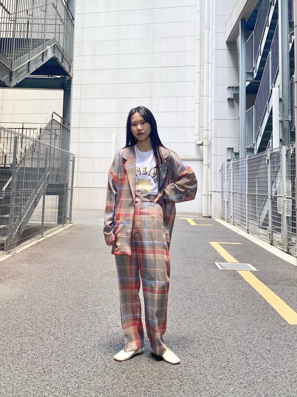 【PENDLETON×H(アッシュ)×CIAOPANIC】のトリプルコラボアイテム。配色がかわいいチェックは他になく、存在感もばっちりです。 【着用アイテム】 ▷ 【PENDLETON×H(アッシュ)】別注チェックテーラードジャケット サイズ感:かっちりしすぎないオーバーサイズ。女性らしさ出すなら、インナーはキャミかタンクトップがおすすめ。 着心地:透け感のある生地なので、着ていて軽いし風通しも◎ ㅤㅤㅤㅤㅤㅤㅤㅤㅤㅤㅤㅤㅤ ▷ 【PENDLETON×H(アッシュ)】別注チェックワイドパンツ(Sサイズ着用) サイズ感:ウエストが少し大きめなのでベルトでぎゅっと絞っています。着丈はハイウエストで履いてくるぶしが隠れるくらい。全体的にワイドすぎずすっきりとした印象。 着心地:ジャケットと同素材ですが、裏地着きなので透け感を気にせず履いていただけます。 ㅤㅤㅤㅤㅤㅤㅤㅤㅤㅤㅤㅤㅤ ▷【MOHI】GU1スクエアトゥバックストラップフラットシューズ(37着用) サイズ感:普段23.5センチのサイズで37着用でちょうどでした。バックストラップはゴムが入っています。 着心地:とても楽な履き心地。今回靴下合わせですが、素足でも女性らしさが出ておすすめです!