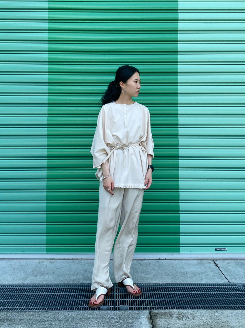 メンズのポンチョをウエストマークして着てみました。ヒッコリースタイルでワントーンに挑戦。ボリュームが出過ぎないよう髪の毛はタイトに結んだのもポイントです。 【着用アイテム】 ▷フリンジオーバーサイズポンチョTシャツ(Mサイズ着用) サイズ感:メンズのMサイズを着用しています。首回りが空いているので、スッキリした印象。オーバーサイズで女の子がゆるっと着るのもかわいくておすすめです。 着心地:分厚くない生地感で、涼しく着れます。長袖とのレイヤードスタイルなら、今の時期から長く活躍しそうです。 ㅤㅤㅤㅤㅤㅤㅤㅤㅤㅤㅤㅤㅤ ▷エステルサテンパンツ サイズ感:159センチでウエストは1回折り曲げて履いています。かなり長い丈なので、長身さんにもオススメ!ただストレートな形なので、お直ししてもらっても大丈夫です! 着心地:サテンで落ち感のある素材。ウエストもゴムなのでとにかく楽な履き心地。